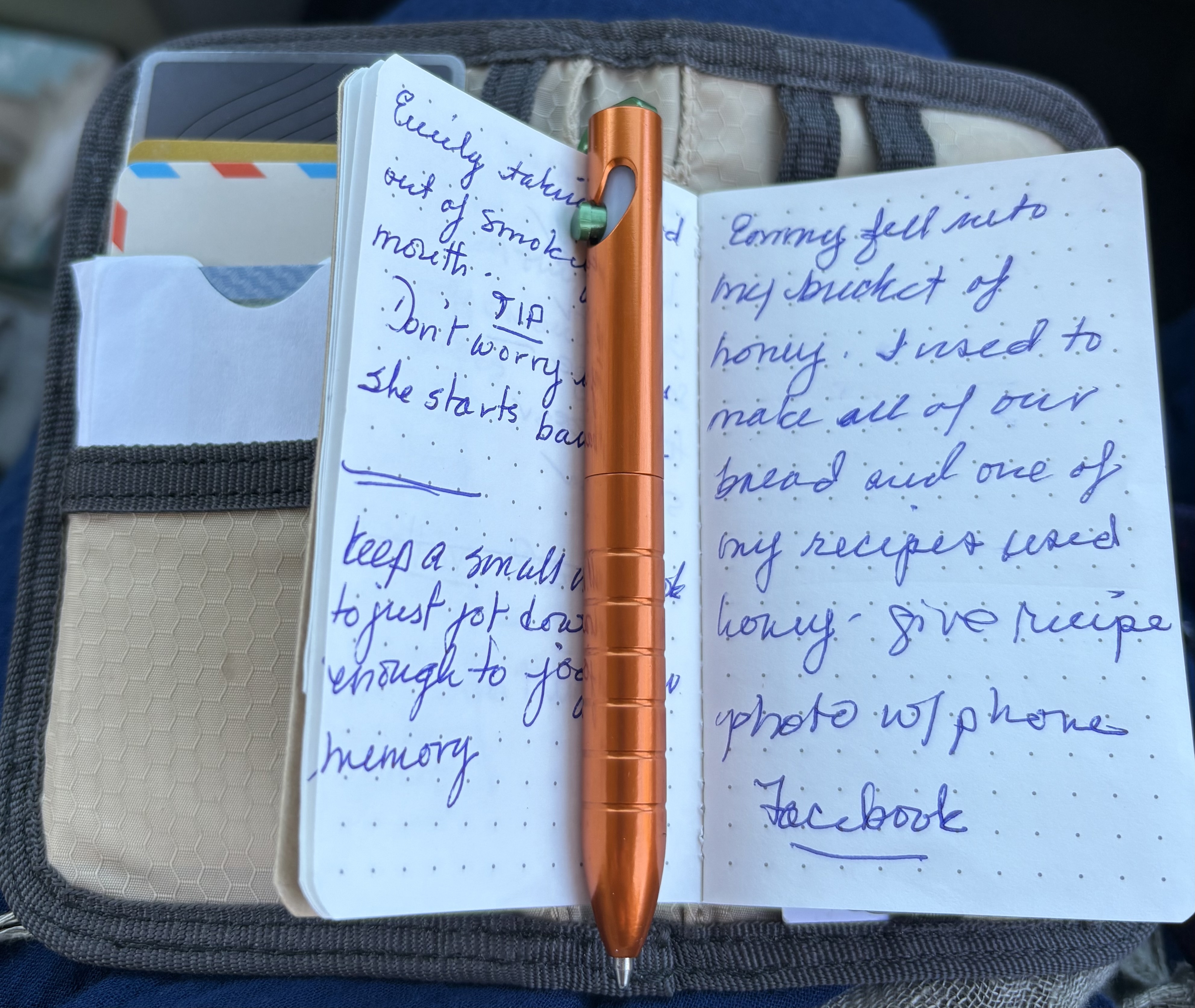 My wallet is a Lochby Sidekick Wallet with a tiny notebook, which is always there to accept any thoughts or market lists that I might need to make note of. I always keep this with me so that those fleeting thoughts don't have a chance to get away. These notes in this photo are about memories from my children's childhood. There are lots of fun stories there that need to be written. Keeping these notes will remind me to do just that. I find that I use this often and recommend keeping this or some kind of notebook/pen combination with you at all times. These give you the ability to jot it down when the epiphany comes.